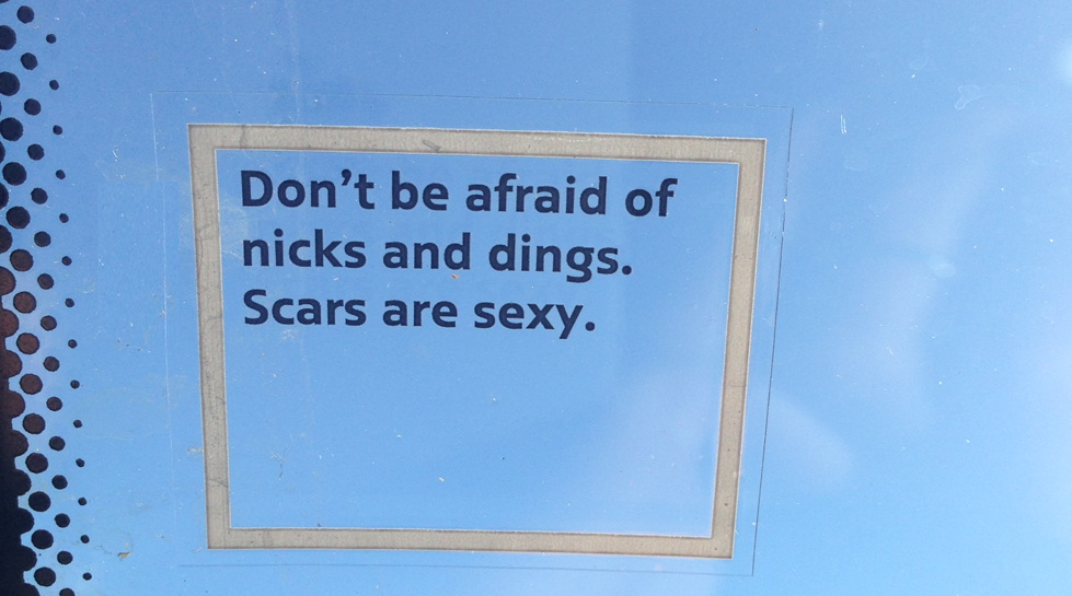 Each time I bring the car in for maintenance, I find little touches left by the people who interacted with my car – MINI gum, thank you and “we were here” notes, and this “Scars are sexy” sticker on the inside of my windshield. Since they are unexpected, I often discover them over time, extending the conversation.